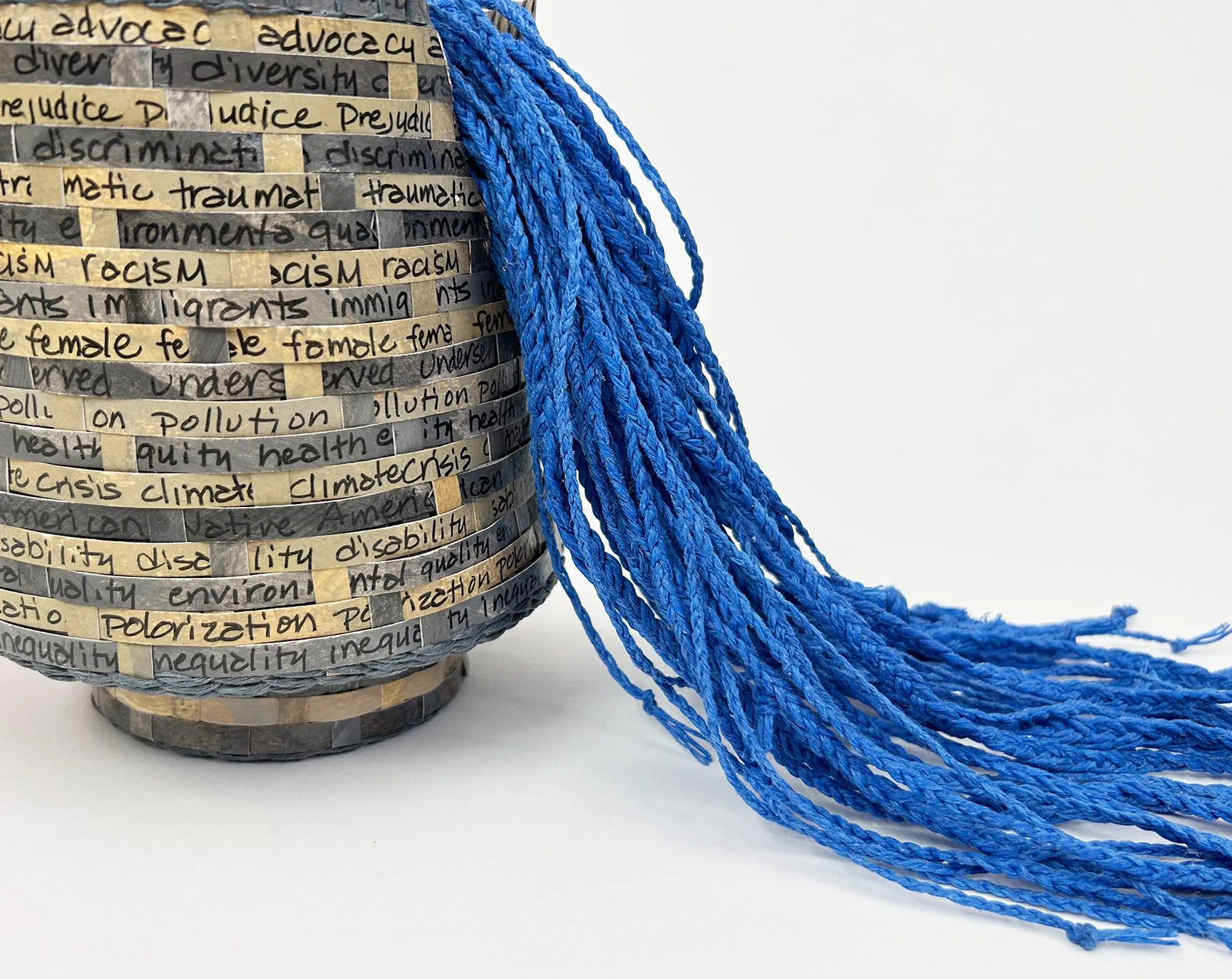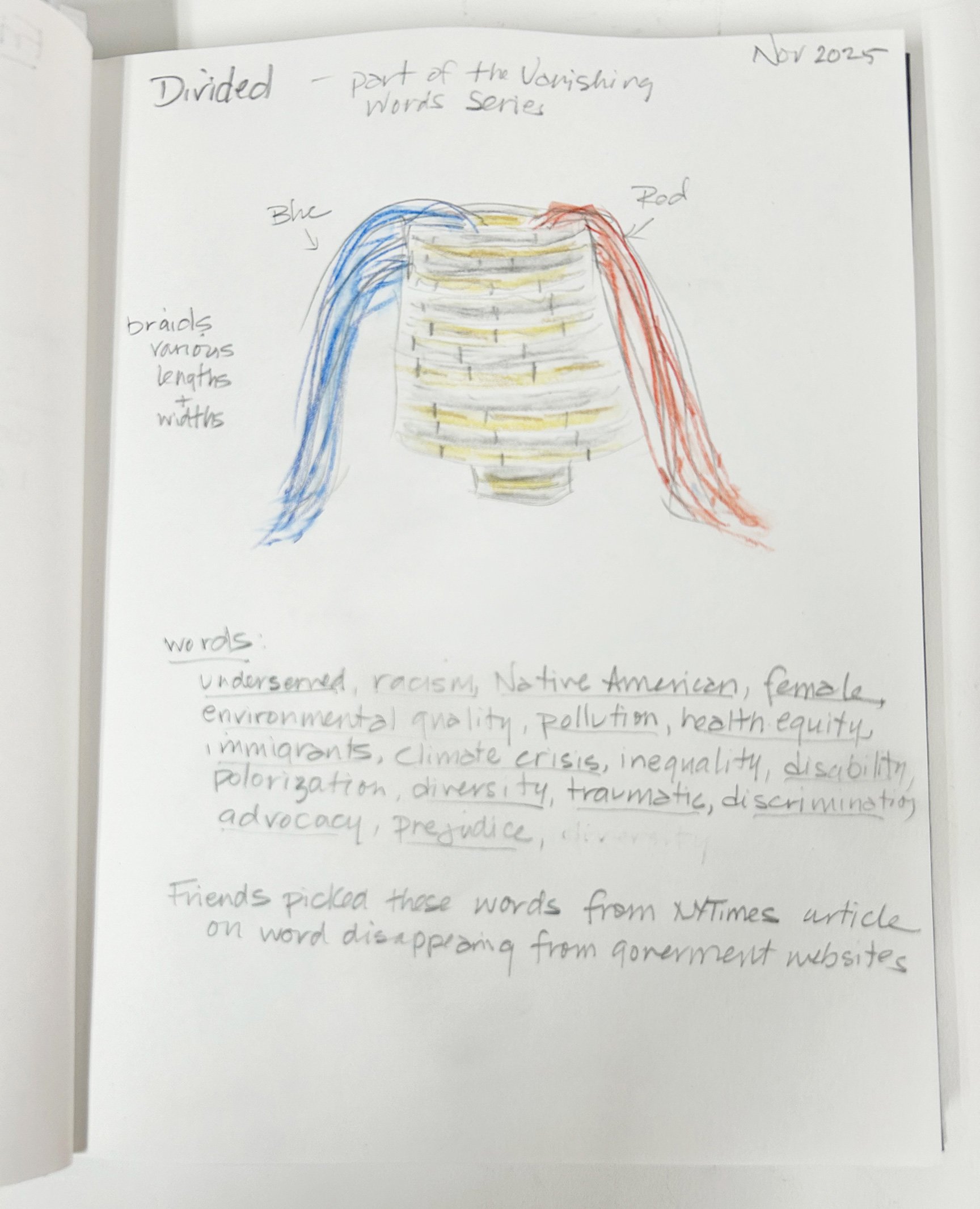 Divided is part of the ‘Vanishing Words’ series, illustrating the partisan chasm currently occurring in the United States. A split solidly aligned by political party and where there is little to no compromise or overlap on issues. An article in The New York Times listed words that have disappeared from government websites since the beginning of the new administration. The vanishing words reflect the themes and topics that divide us. The words illustrated on Divided were selected by a group of friends from the list of removed words.