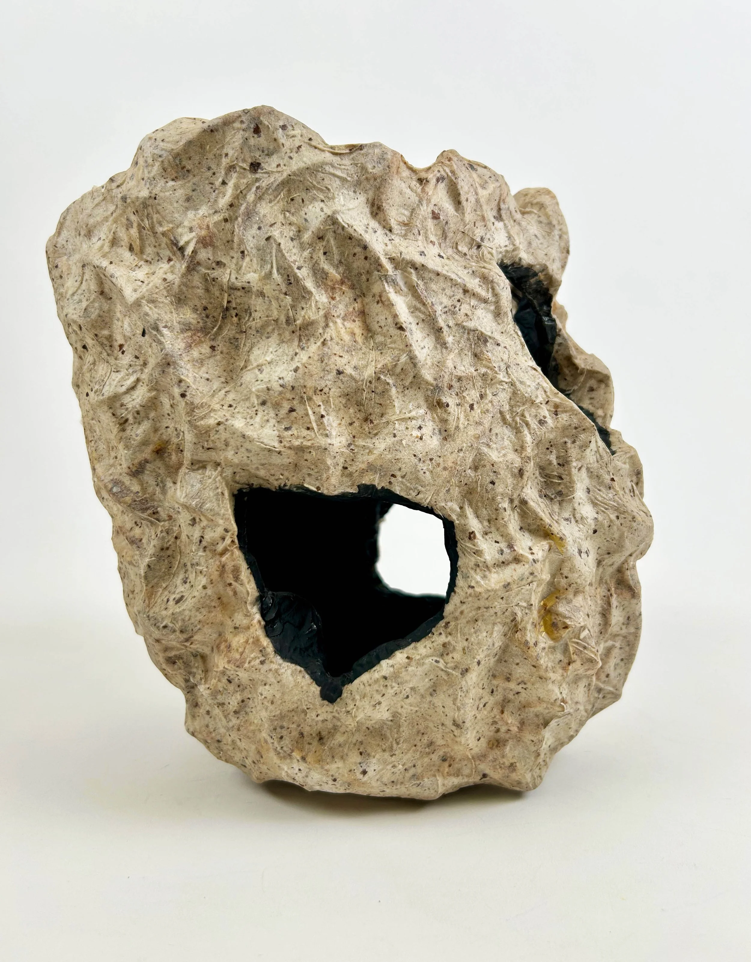 The Darkness Cometh vessel appears to be being taken over by the blackness. Graphite pigment paint fully covers the interior of the vessel and spreads onto the outer surface. The work is constructed with a random weave skeleton-a paper skin is applied to the woven skeleton.